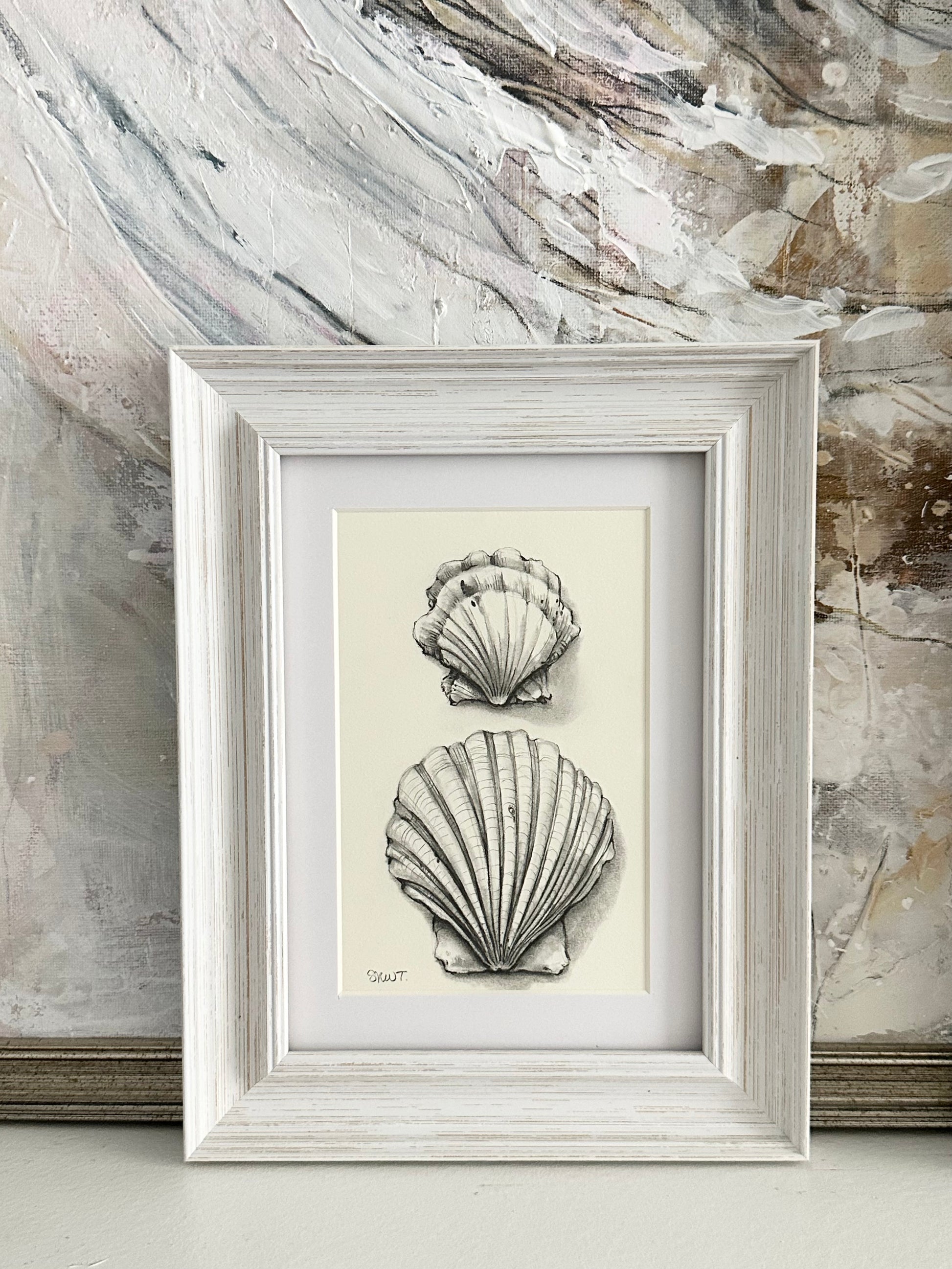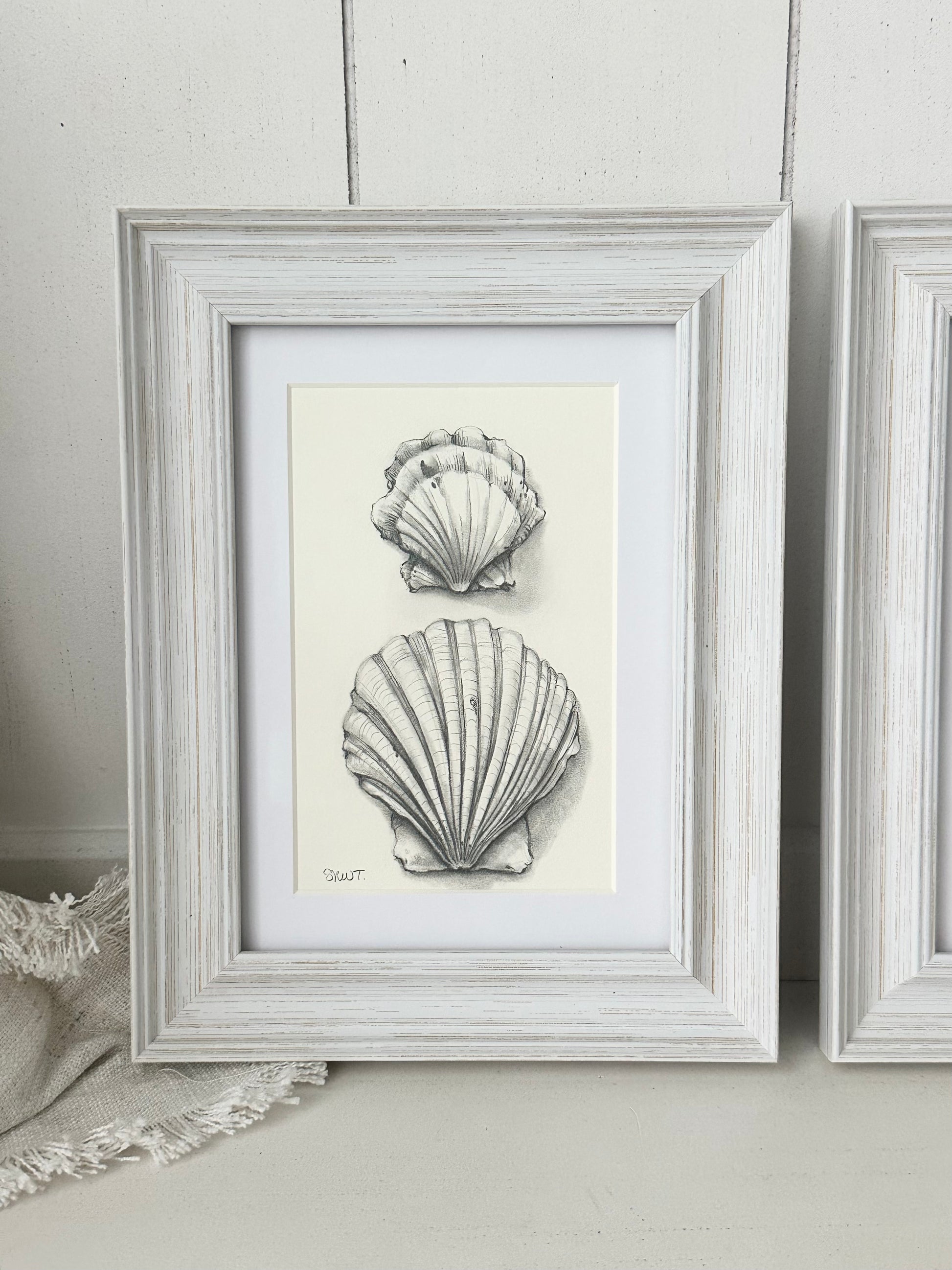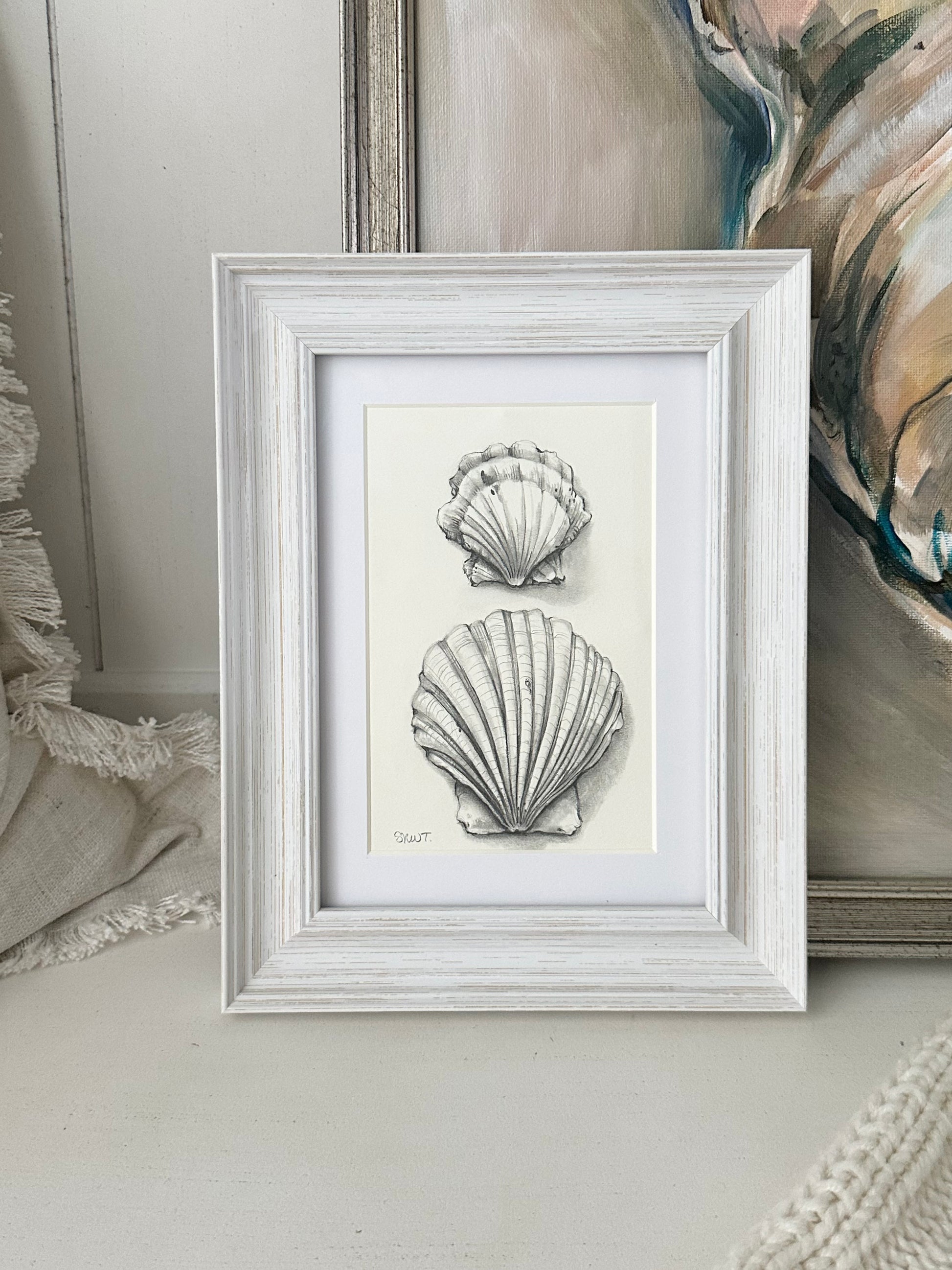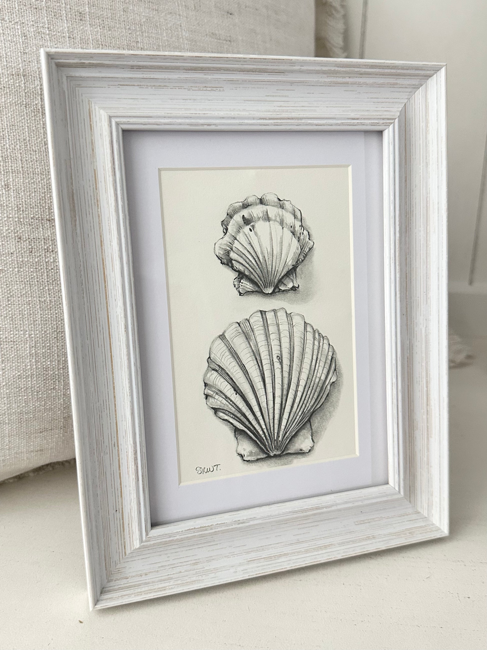 This drawing comes framed in a rustic coastal frame with 99% UV protectant acrylic and acid-free matting for a final size of 7" x 9".