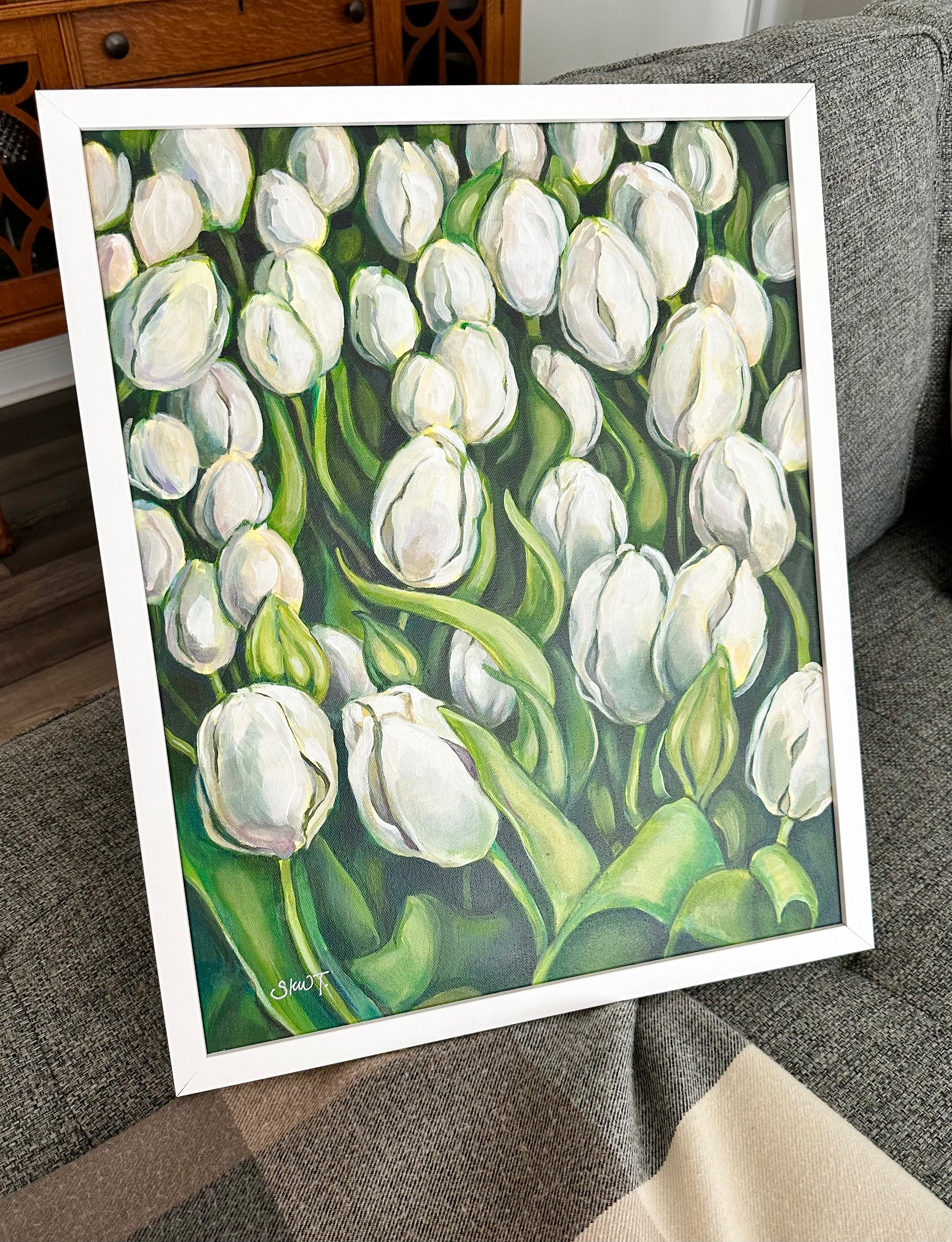Framed in a thin, white wooden frame.